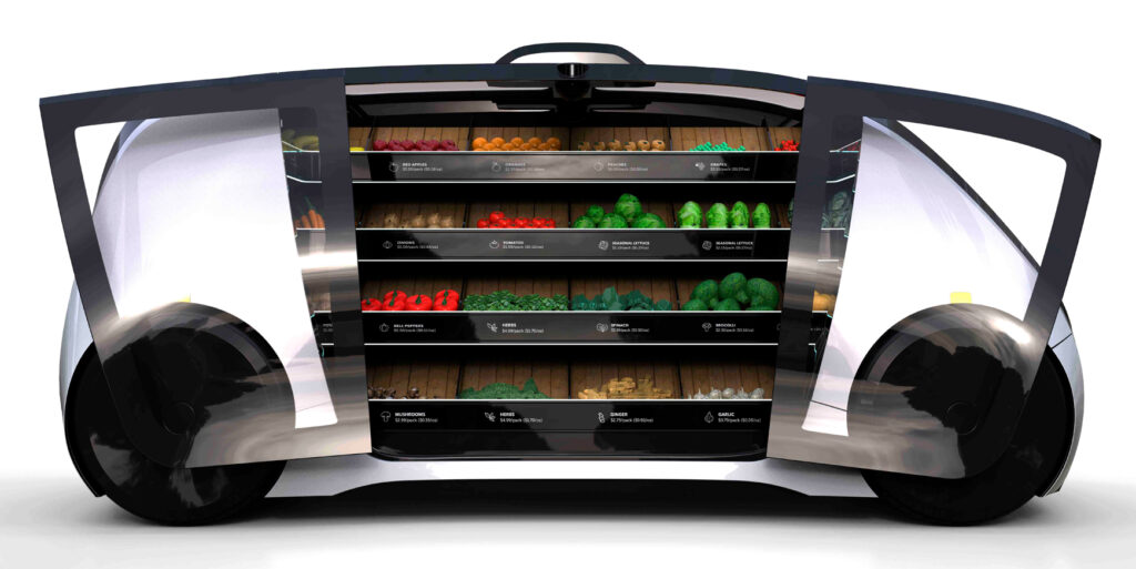 Forestil dig, at du ikke behøver at tage i supermarkedet, men at supermarkedet kan komme til dig. Ikke et bud med indkøb, men en hel afdeling – for eksempel frugt og grønt. Det er tanken bag Robomart; selvkørende biler, der er smækfyldt med varer og skal køre rundt på må og få i byerne, indtil de bestilles til levering via en app. Nu er det ikke fordi vi vil skabe unødig bekymring, men der er en episode i den seneste sæson af Netflix-serien Black Mirror, hvor en selvkørende pizzabutik er involveret i et uheld. Det er ikke fordi vi antyder, at Robomart-folkene ser for meget Netflix, men Robomart ser bekymrende bekendt ud …