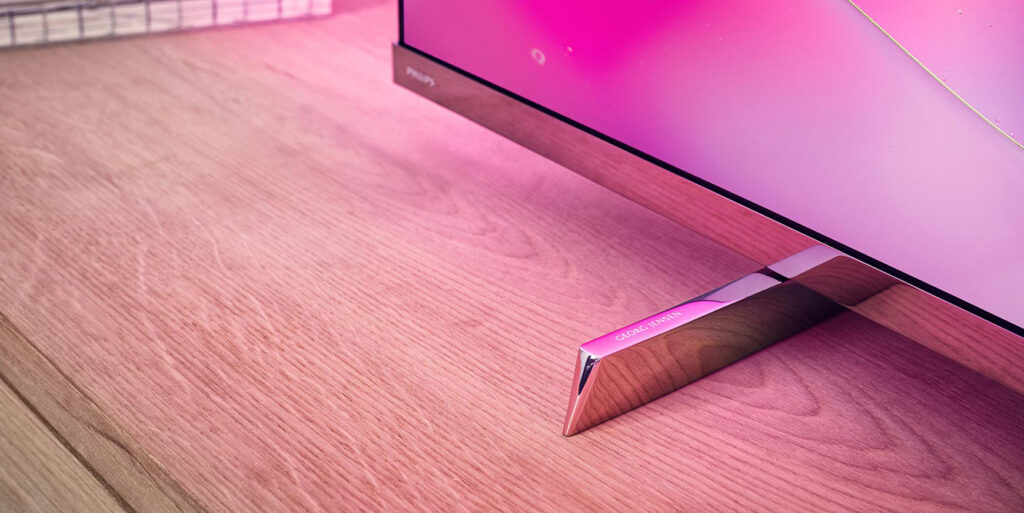 Det danske designfirma Georg Jensen har snittet fødderne til Philips 9104, der er et 55 tommer stort 4K UHD LED-tv – og som det ses på billedet, så er det ret tydeligt, at Georg Jensen har været ind over. Philips skriver selv, at tv’et har ”slank, sort ramme med en poleret stålramme i bunden og ditto elegante fødder; alt udformet i tidløst, æstetisk design”. Derudover har Philips brugt stof fra danske Kvadrat til at dække højttalerne på flere af modellerne.