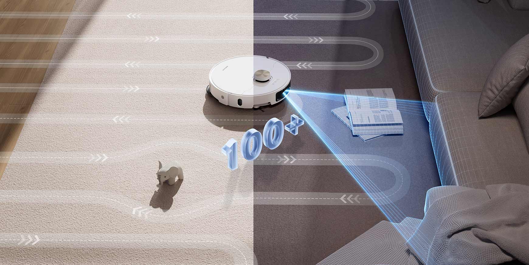 Har du mange ting på gulvet, er Dreame L40 Ultra det bedste valg. Den har 3D-struktureret lys og en indbygget LED-lampe, der kan genkende op til 100 objekttyper, selv i mørke rum og under møbler. Med den udfoldelige RoboSwing-børste kan den rengøre grundigt omkring ting, stoleben og i hjørner.