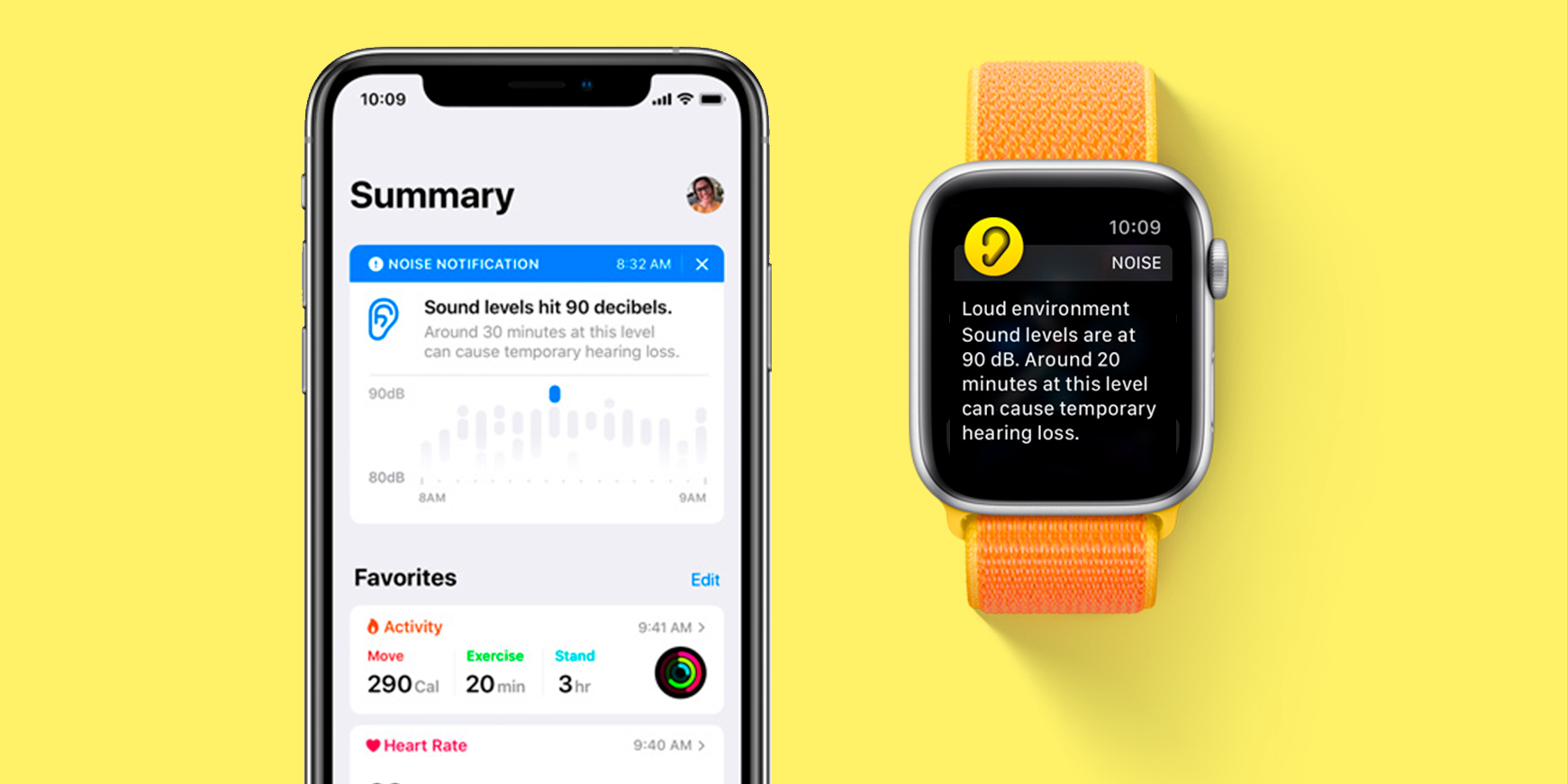 At kunne bevare en god og sund hørelse påvirker livskvaliteten positivt, og undersøgelser har vist, at tab af hørelse er blevet forbundet med kognitiv tilbagegang. Med Apple Watch’ optimale placering på håndleddet hjælper Noise-appen i watchOS 6 brugerne med at forstå lydniveauet i omgivelser såsom koncerter og sportsbegivenheder, der kan påvirke hørelsen negativt. Når lydniveauerne ændrer sig, bevæger appens decibelmåler sig i realtid. Uret kan sende en notifikation, hvis decibelniveauet når 90 decibel, hvilket ifølge Verdenssundhedsorganisationen kan begynde at påvirke hørelsen efter fire timers eksponering om ugen på dette niveau.