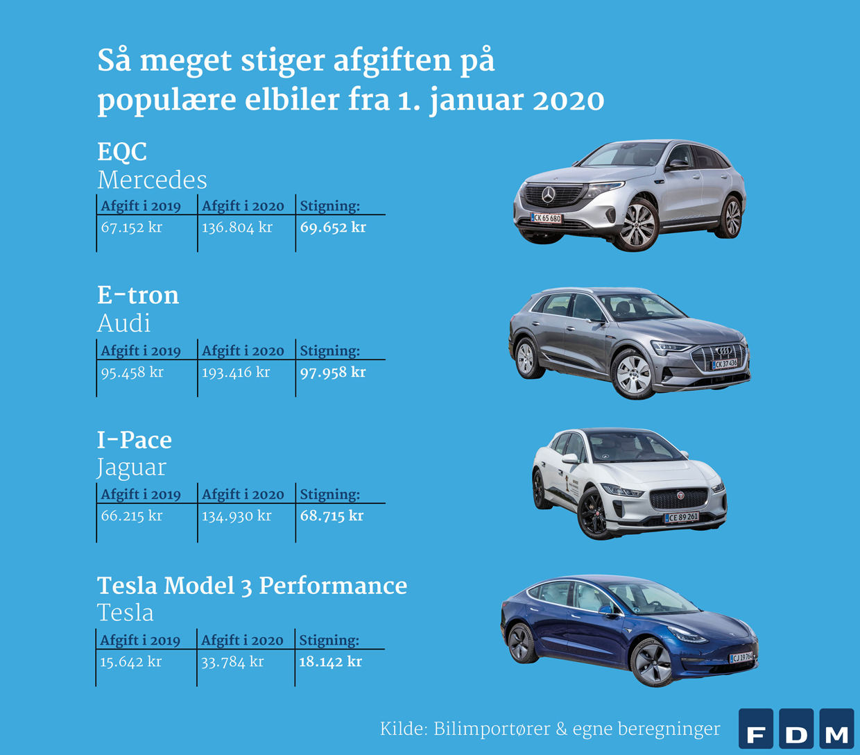 Om fire år vil afgifterne på elbiler være fuldstændig udfaset, men allerede til nytår stiger afgiften på de dyreste elbiler med 20 procentpoint – og det er et problem, mener FDM, der argumenterer for, at det netop er de store benzin- og dieseldrevne SUV’er, der skal væk fra vejene, hvis CO2-udledningen skal ned.