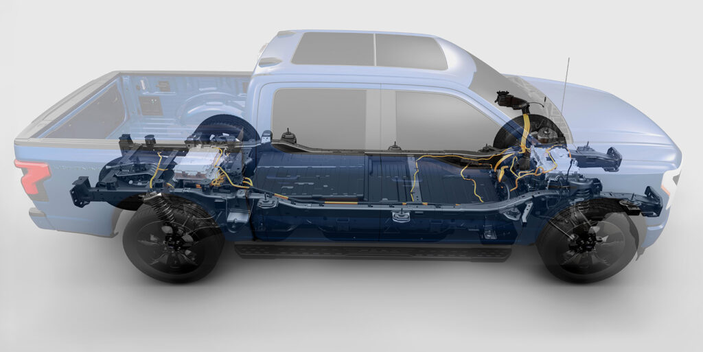 Ford har udrustet Lightning med to spektakulært store batterier, der giver den store, tunge bil en rækkevidde på enten 370 kilometer (Standard Range) eller 480 kilometer (Extended Range). Det er målt med den amerikanske EPA-målemetode, der generelt anses for at være mere ‘stram’ end WLTP, som vi bruger her i Europa. Batteriernes kapacitet er ikke offentliggjort, men der gættes på, at de er på henholdsvis 138 kWh og 170 kWh. Til sammenligning er batteriet i Tesla Model 3 Performance, der er den længstrækkende, på ‘bare’ 82 kWh.