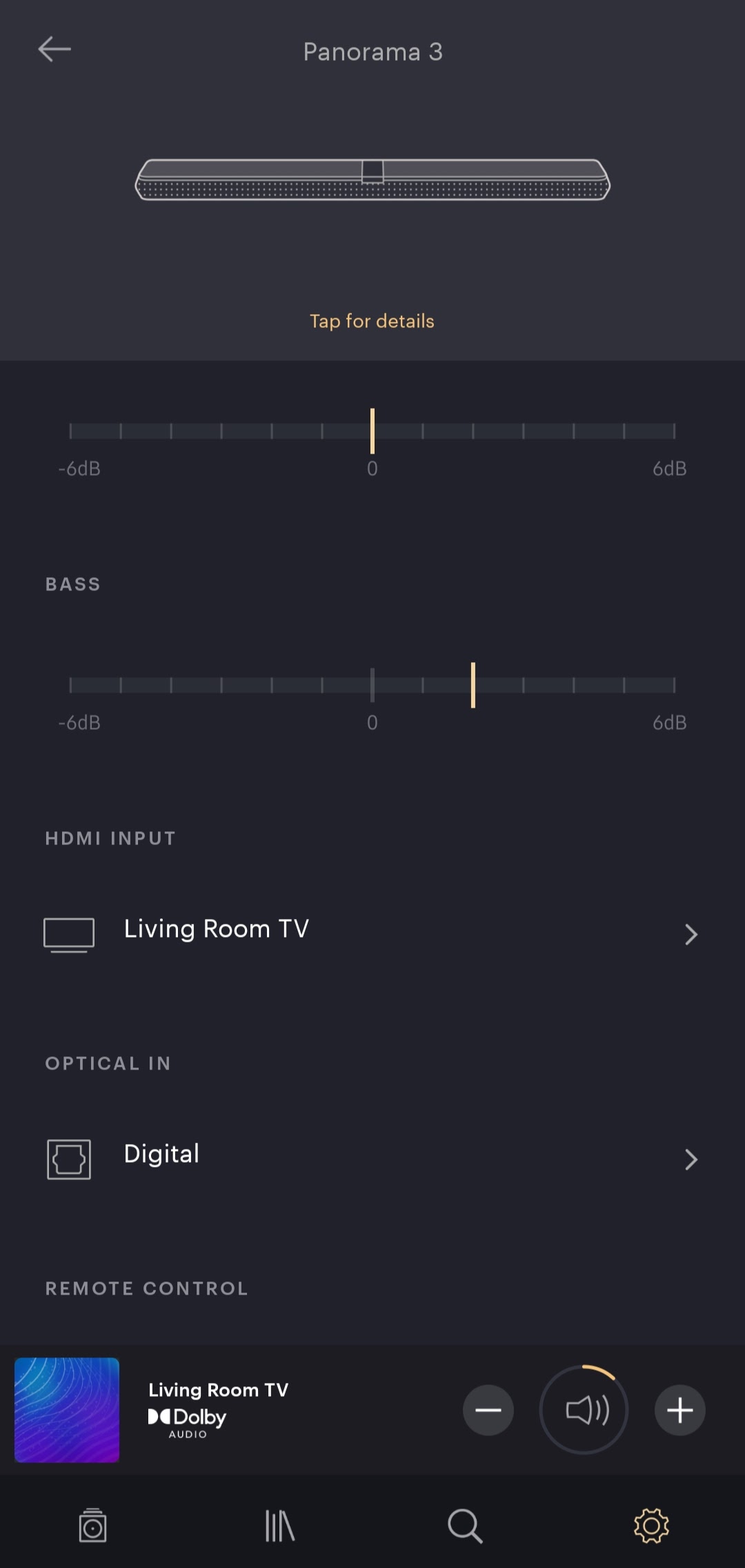 Styringen af Panorama 3 foregår ligeledes i B&W’s Music-app. Selvom jeg har stor tiltro til B&W’s evner udi lyd, så er det skuffende at alt jeg får lov at dreje på er diskant og bas. That’s it. Hvor er nat-indstillingen, så man kan se film en sen aften uden at vække det halve nabolag? Hvor er justeringen af Atmos-effekten, så jeg måske havde fået udbytte af den funktion?