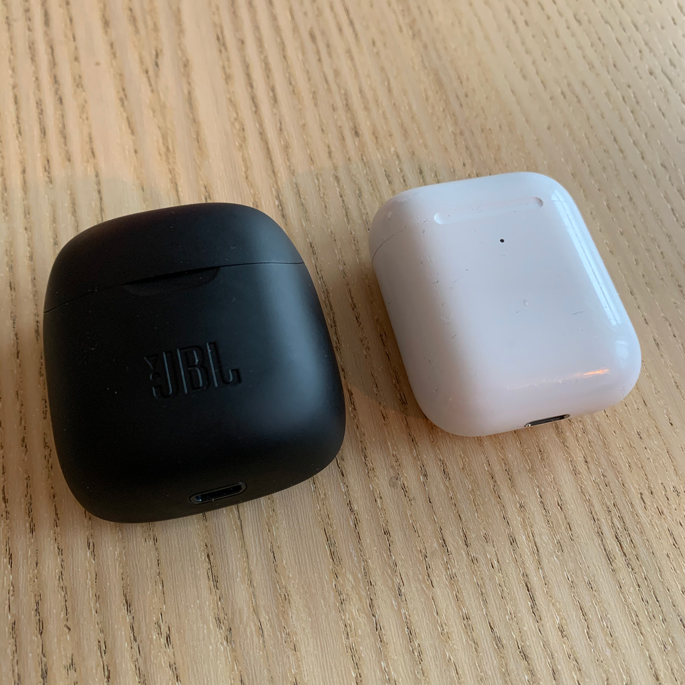 JBL har adopteret den velkendte AirPods-formfaktor med ”tandbørstehoved”-designet, hvor mikrofonerne er placeret for enden af en stang, der går ned mod kinden. Opladeretuiet er en smule større end AirPods ditto, men har også afrundede hjørner.