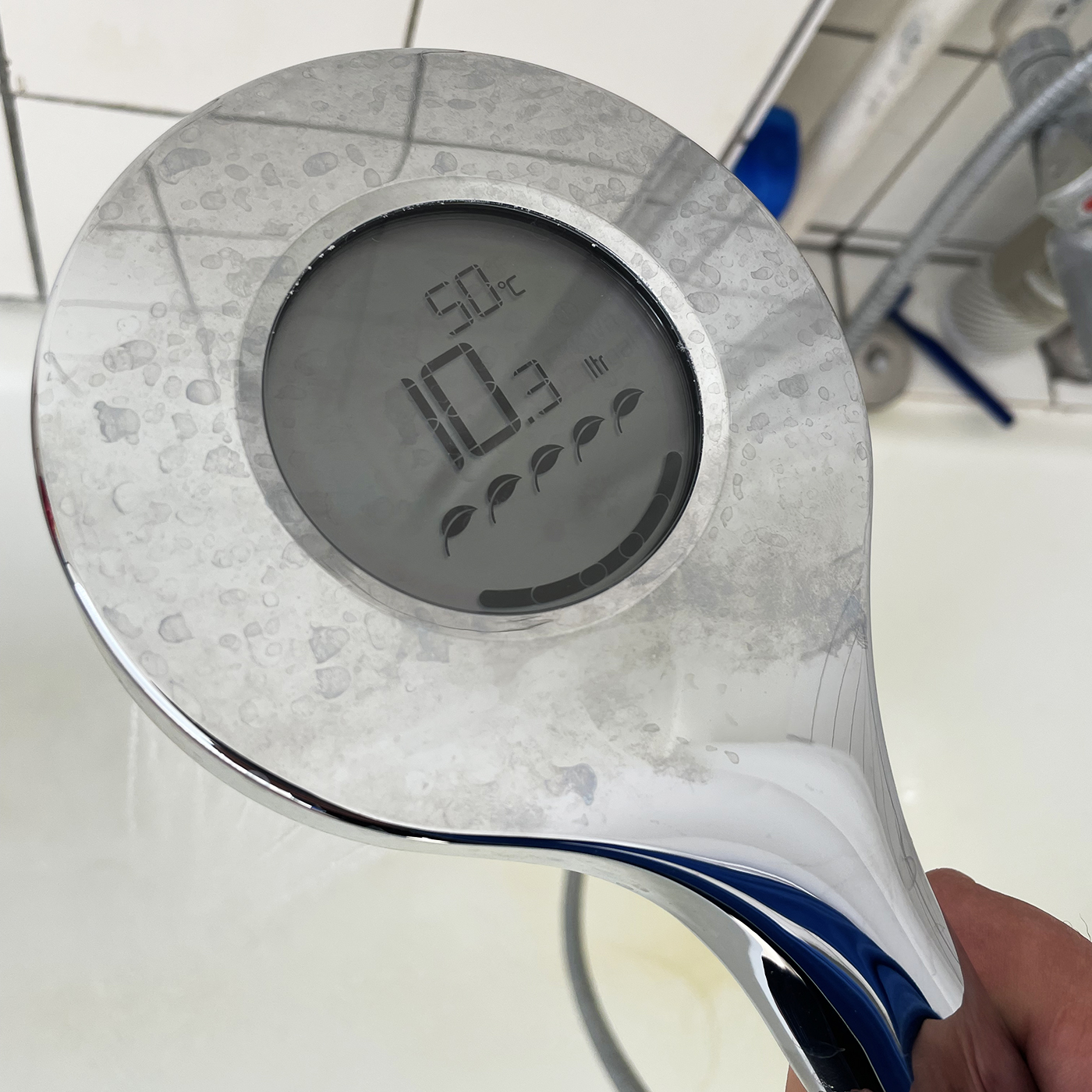 Ovensiden af brusehovedet domineres fuldstændig af en skærm, der viser informationer om forbruget (mere om det senere) og den er godt tænkt. Skærmen bruger nemlig ikke batteri. I stedet får den strøm fra en lille turbinemotor, der er gemt i bruserens indre. Hver gang vand løber gennem bruseren tændes både skærmen og en Bluetooth-forbindelse til mobiltelefonen, så data kan overføres til den medfølgende app og gemmes. For skærmen slukker i sagens natur, når vandet holder op med at løbe.
