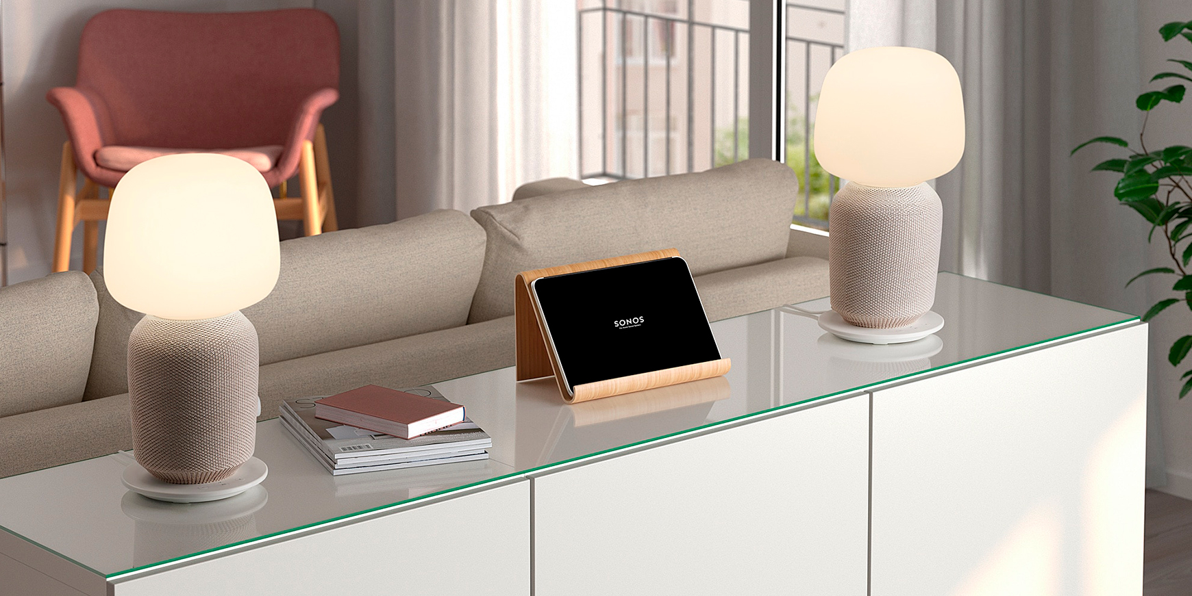 Sæt en Sonos Beam soundbar til fladskærmen og tilslut to Symfonisk Bordlamper som baghøjttalere, så har du både et komplet surroundsystem og lys til hele stuen for 6.500 kroner.