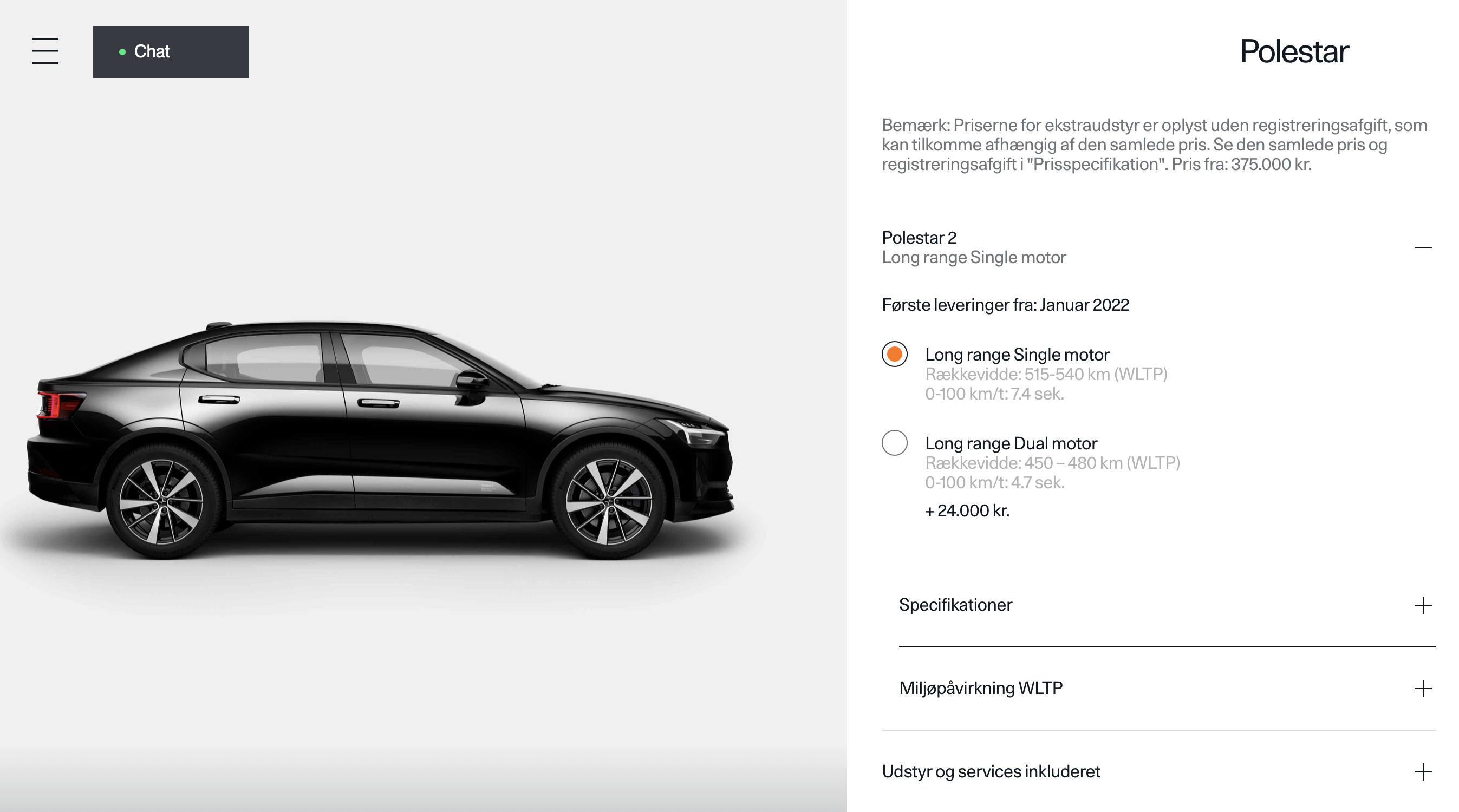 Så vidt vi umiddelbart kan gennemskue, er udstyrsniveauet i de to udgaver identiske. Der er ligeledes mulighed for at udvide både Single- og Dual Motor med udstyrspakker – Plus-pakken og Pilot-pakken. Det kan gøres fra Polestar.com, hvor det digitale salg af begge udgaver blev skudt i gang den 21. september.