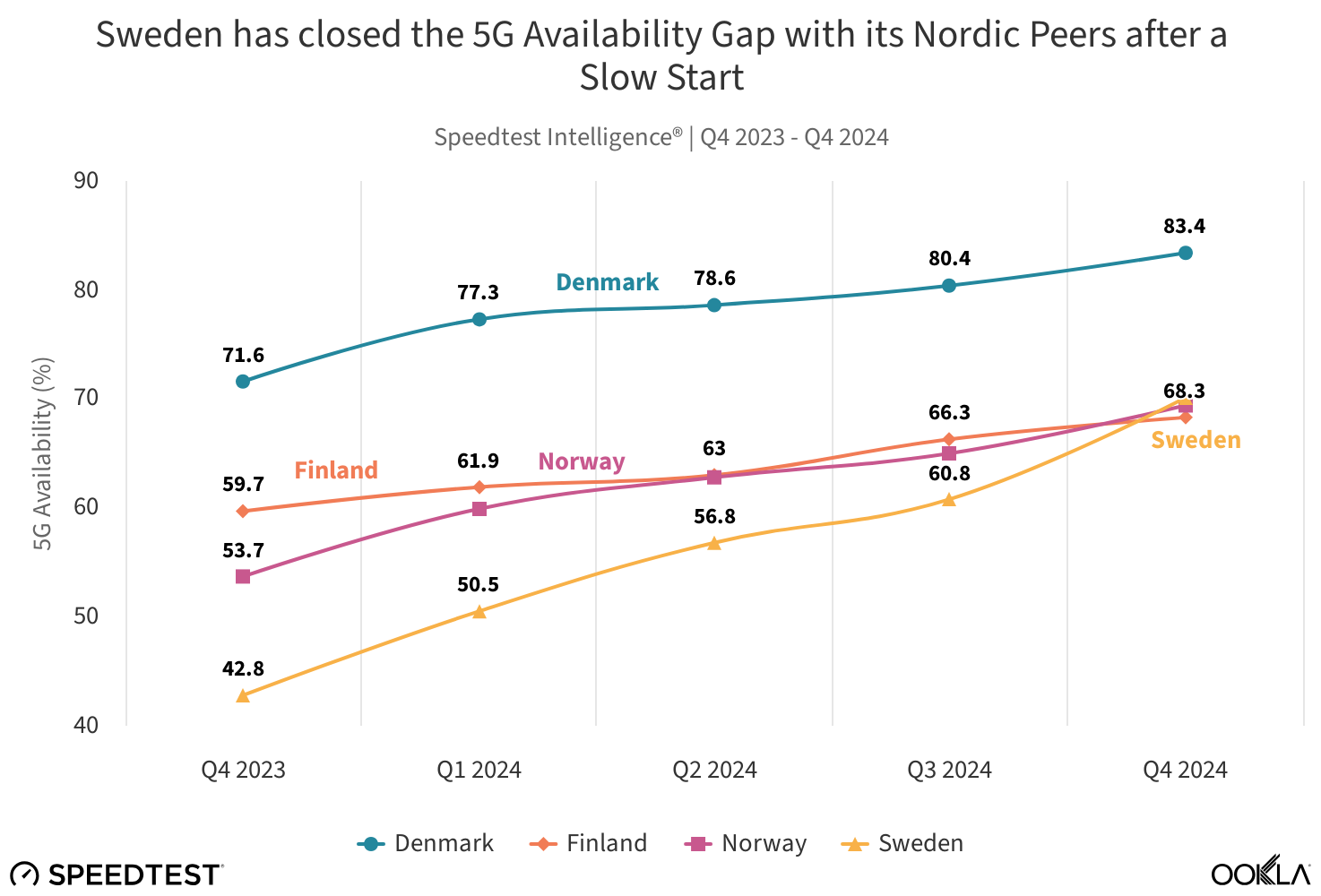 5G-dækningen i de nordiske lande (grafik: Ookla).