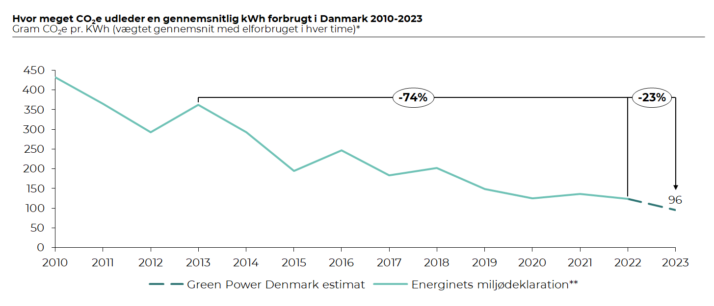 I 2023 kom hele 82 procent af den strøm, vi danskere forbrugte, nemlig fra vedvarende energikilder. Det betyder, at CO2-udledningen fra en gennemsnitlig kWh i en dansk stikkontakt i 2023 blot var 96 gram.