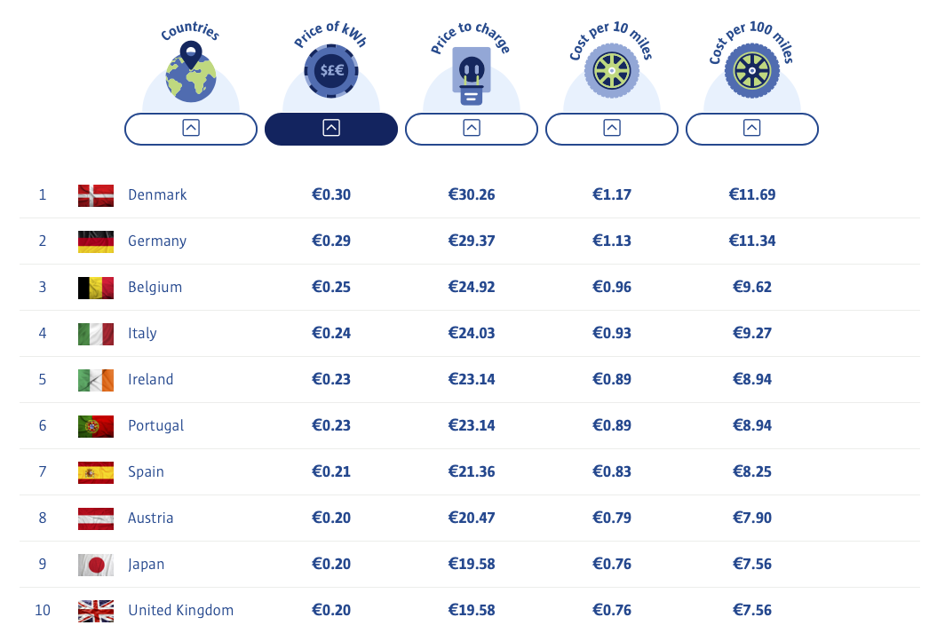 Ærgerligt nok topper Danmark listen over de 37 lande, hvor det gennemsnitligt er dyrest at oplade sin elbil. Det er naturligvis et tal, der skal tages med et gran salt, da forskellige individuelle aftaler eller abonnementer kan have stor indflydelse på elprisen for hver enkelt. Men priserne på listen er et gennemsnit, hævdes det. De angiver prisen i Danmark til at være 0,30€ – 2,24 kroner per kilowattime. Det koster altså 11,69€ (87,29 kroner) at køre 100 kilometer i sin Tesla Model S og 225,96 kroner at lade bilen helt op.