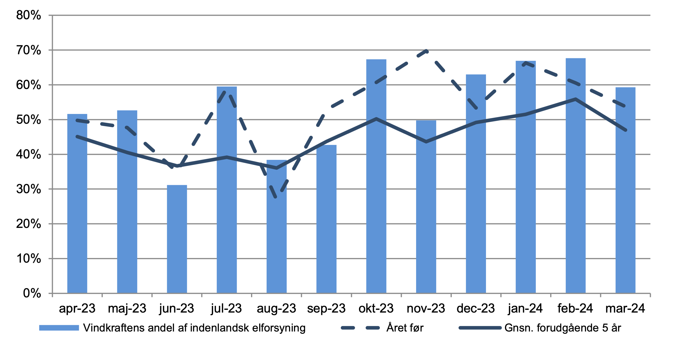 Den samlede vindkraftproduktion i de første tre måneder af 2024 var 16,6 procent højere end i tilsvarende periode i 2023. Den samlede vindkraftproduktion i de første tre måneder af 2024 var faktisk 27 procent højere end gennemsnittet for perioden de forudgående fem år.