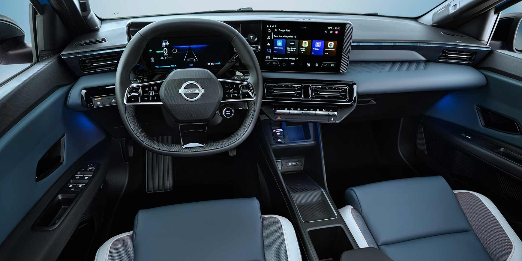 Indvendigt er kabinen præget af et rent og moderne layout med to store 10,1-tommer skærme og mulighed for at tilpasse stemningsbelysningen i 48 farver. Nissan lægger op til, at føreren skal kunne tilpasse bilen efter humør, både visuelt og køremæssigt.