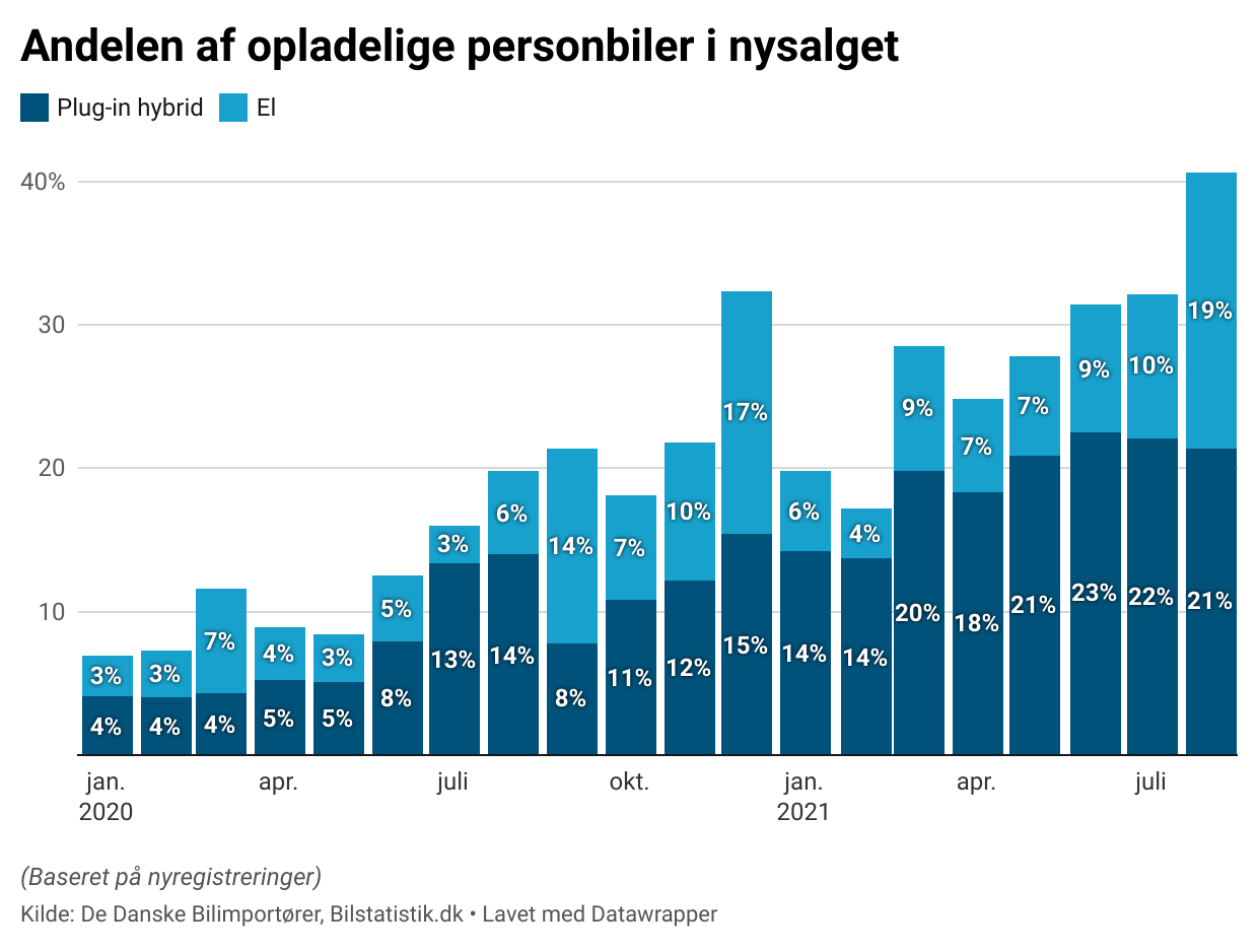 Med 6.453 nye elbiler og plug-in hybridbiler udgjorde de opladelige biler 40 procent af augusts samlede aktivitet – den højeste andel i Danmark nogensinde. Til sammenligning udgjorde de opladelige biler 20 procent af bilsalget i august 2020.