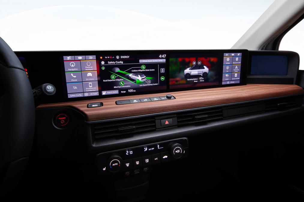 Instrumentpanelet domineres af to 12,3 tommer store trykfølsomme skærme, der strækker sig i hele bilens bredde (flankeret af de to sidespejlsskærme). Skærmene rummer både underholdning, betjening af bilen og køredata, såsom hastighed, rækkevidde og navigation., Apropos navigation kan forsædepassageren indtaste destination på sin skærm og ”sende” navigationen til chaufførens skærm.