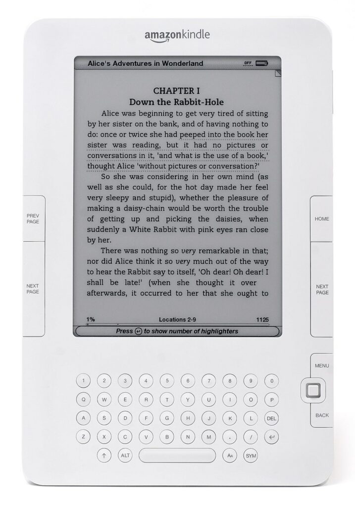 Når man nu levede af at sælge bøger elektronisk, var det også oplagt at lave en elektronisk læser til de elektroniske bøger. Amazons laboratorie havde arbejdet på Kindlen siden 2004, og den første udgave kom på gaden i 2007, og i oktober sidste år nåede de den niende generation. Tanken var at lave en uhyre enkel og nem ebogslæser, hvis overflade mindede mere om papir end en skærm og derfor var mildere mod øjnene. At den så samtidig var enkelt og nemt koblet op til Amazons kæmpe katalog af bøger, hjalp også på det.