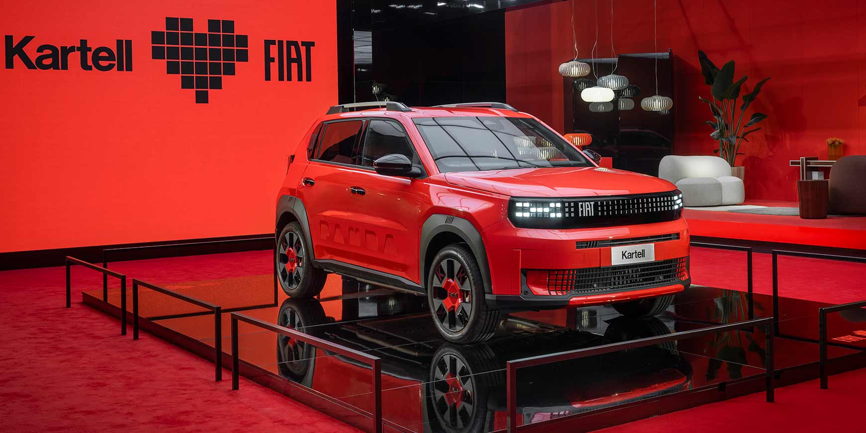 Den nye Grande Panda Kartell er kendetegnet ved en dristig rød lakering og en Tasmania Blue kabine, hvor detaljer som Kartells logo og mønstrede tekstiler fremstillet af genbrugsmaterialer skaber en eksklusiv stemning. Inde i bilen gemmer sig også en sjov overraskelse: Den klassiske Kartell-lampe Bourgie er blevet en del af instrumentbrættet som et legende påskeæg.