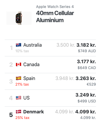 For eksempel kan du købe Apple Watch Series 4 4G for bare 3.177 kroner i Canada, mens det koster 4.099 kroner herhjemme. Til gengæld er det pænt dyrt i Sverige, hvor den samme model koster 4.372 kroner.