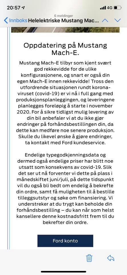 I mailen skrives der, at leveringer forventes at begynde i november måned i stedet. Men en talsmand fra Ford vil ikke endeligt bekræfte det overfor Electrek, men siger i stedet, at Ford vil komme med en officiel udtalelse, når fabrikkerne er helt oppe i omdrejninger igen og firmaet har fået et bedre overblik over Mach-E produktionen.