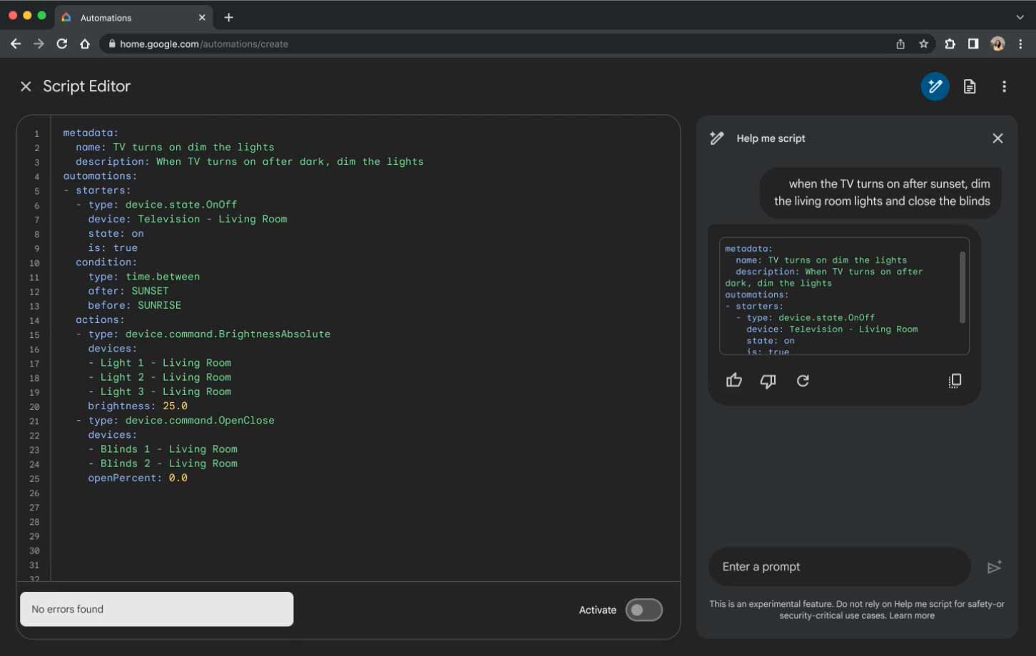 Når du logger ind på din Google Home-konto på Google Home til nettet og åbner script-editoren, beskriver du blot, hvad du ønsker, der skal ske i et naturligt sprog. Google giver eksemplerne: “Hvis mit udendørskamera ser nogen efter mørkets frembrud, så tænd for verandalyset og lav en meddelelse” eller “Når røgalarmen går i gang, skal du blinke med alt lys i huset og meddele en nødsituation over højttalerne.”