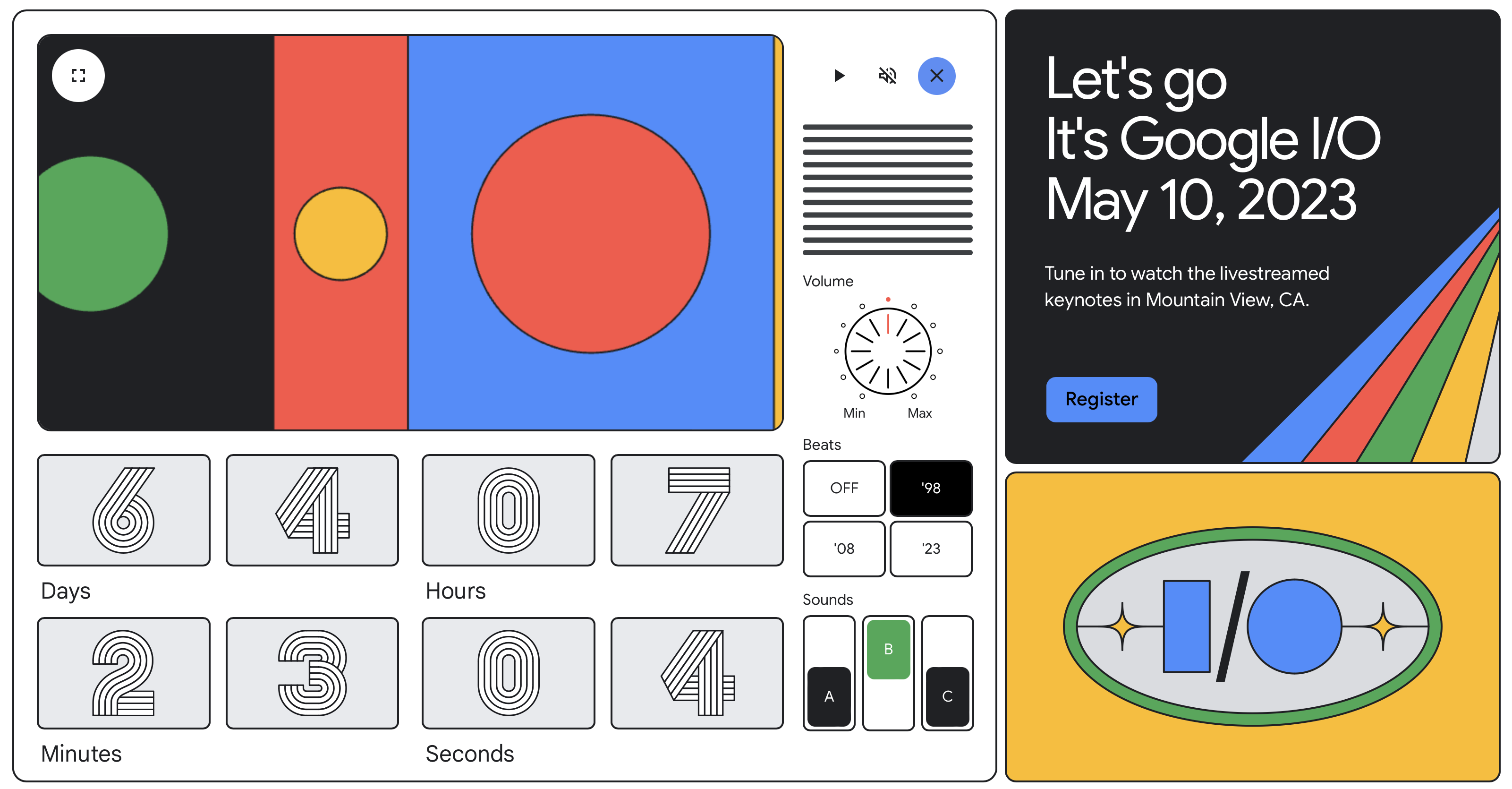 Google I/O-hjemmesiden viser nedtællingen og andre oplysninger. Alt sammen arrangeret i fliser med plads til meddelelser, der ligner det, der kan findes på en mobilenhed.