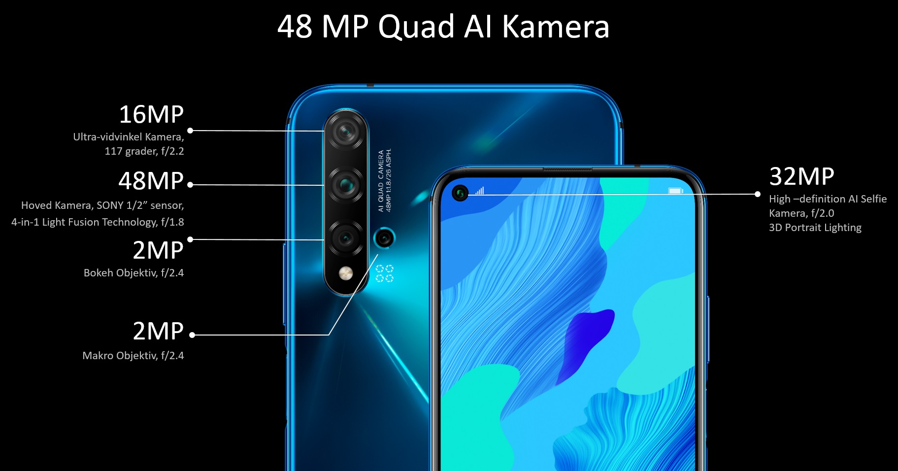 Hovedkameraet er på 48 megapixel og kamerapakken på bagsiden giver mulighed for at tage ultra-vidvinkel-fotos samt makro og Bokeh fotografier (dybdefotografier) af både landskaber og close-ups. Her en oversigt over kameraerne på Nova 5T (klik for at se større udgave):