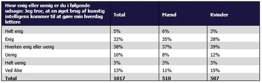 Til gengæld skal der mennesker til, når det handler om undervisning (8 procent) og børnepasning (3 procent). Disse er arbejdsområder, som færrest danskere angiver, at de ville være komfortable med at lade computere med kunstig intelligens varetage.