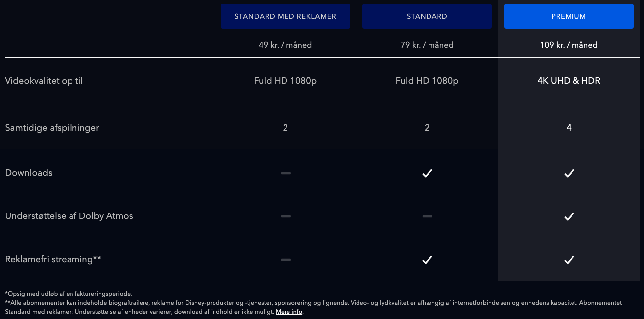 Hidtil har det været standard at kunne se indhold i 4K UHD og HDR med Dolby Atmos-lyd, såfremt dit udstyr har understøttet formaterne. Den mulighed er nu flyttet til det nye Premium-abonnement til 109 kroner pr. måned. Består husstanden af flere der ofte benytter Disney+ samtidig, så er det også i den retning man må kigge, da den fordobler antal samtidige afspilninger.