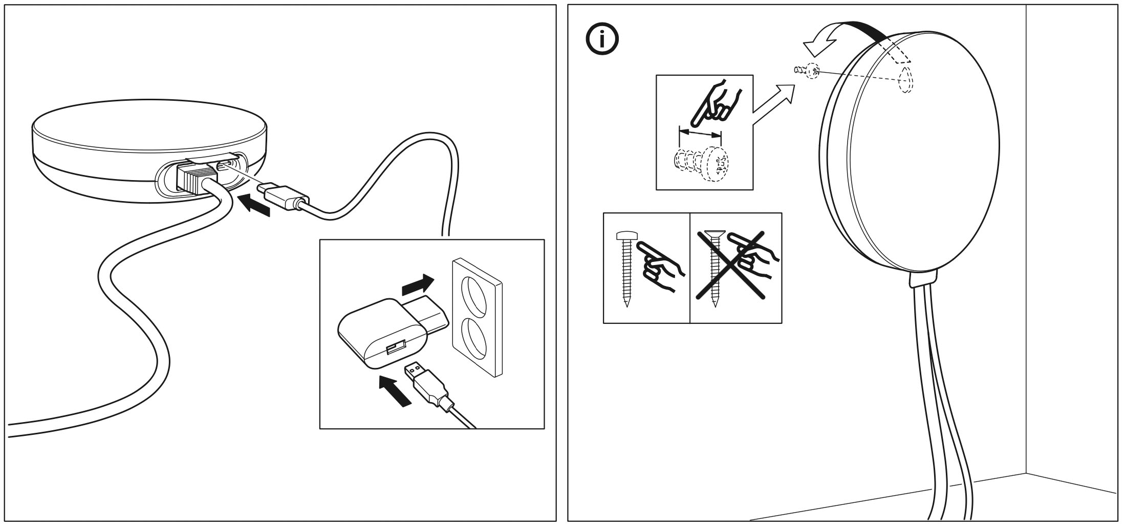 Hvad vi dog ved om Ikea Dirigera, er, at den har to stik: Et USB-stik til strøm og et netværksstik. Det er angiveligt også muligt at hænge den op på væggen. Det viser ovenstående illustration fra Ikeas vejledning.