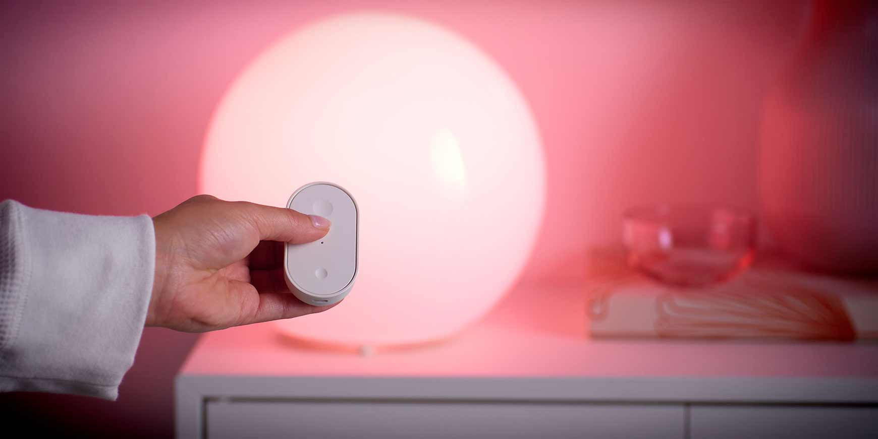 - BILRESA fjernbetjening med drejehjul – Giver dig mulighed for at styre smarte produkter med et enkelt drej. Brug den til at tænde og slukke, dæmpe, skifte farve eller styre en gruppe eller scene.