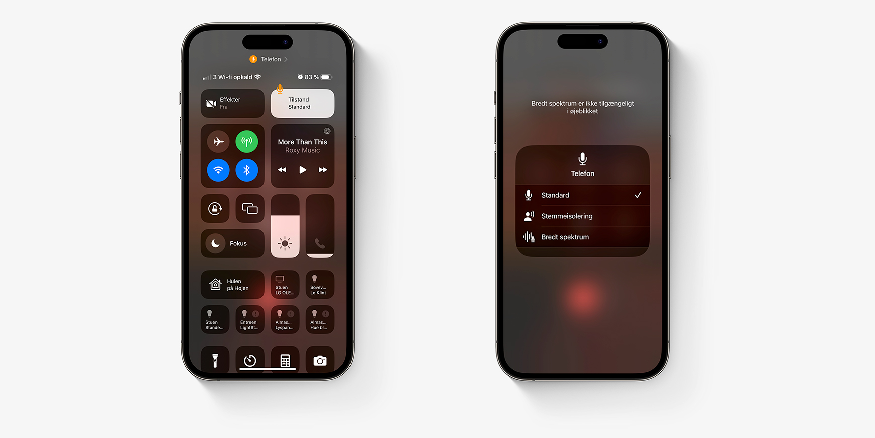 Den nye funktion aktiveres ved at trække Kontrolcenteret ned, mens du er i et opkald. Ved at trykke på ikonet Tilstand (i øverste højre hjørne) kan du skifte mellem Standard og Stemmeisolering.