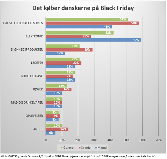 Det er især to varegrupper, som trækker læsset, når det kommer til Black Friday. Øverst på indkøbssedlen hos 51 pct. af de handlende finder man tøj, sko og accessories, mens 42 pct. går efter elektronik. Der er dog markant forskel på, hvad henholdsvis mænd og kvinder går efter. For de mandlige handlendes vedkommende er det med 59 pct. især elektronikken, som er i sigtekornet, mens 58 pct. af kvinderne er på jagt efter tøj og sko.