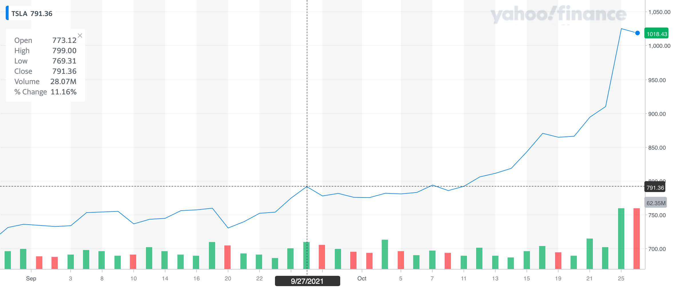 Siden dengang er aktiens værdi steget fra under 800 dollars til p.t. 1080 dollars.