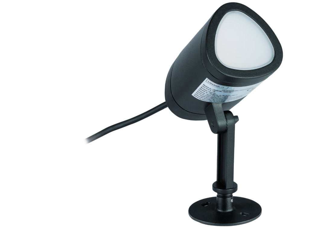 - Udendørs LED-spot med justerbar hældningsvinkel og beskyttet mod vandstråler (IP65)