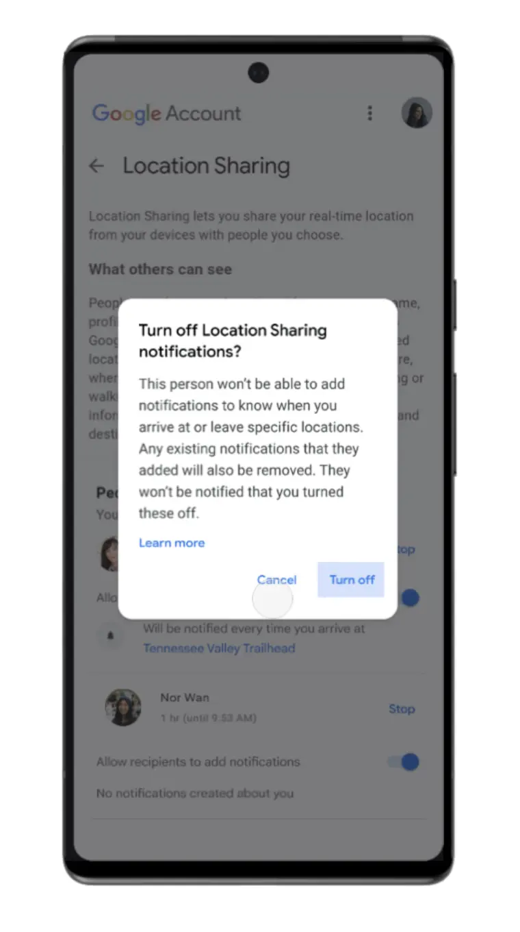 Om nødvendigt kan du blokere for, at en given person kan opsætte notifikationer omkring din færden. Eller slå notifikationsdeling fra med vedkommende.
