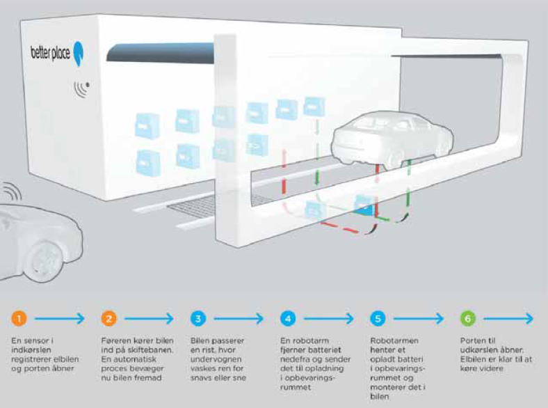Better Place har investeret gigantiske summer i en infrastruktur, der skal gøre det muligt at køre fra den ene ende af Danmark til den anden i elbiler, ved at skifte batteriet ud for hver cirka 100 kilometers kørsel. Skiftet foregår på batteriskiftestationer; bygninger der mest af alt minder om vaskehaller til biler. Alt foregår automatisk og tager ikke mere end fire-fem minutter – målet er, at det ikke skal tage længere tid end at fylde tanken på en benzinbil.