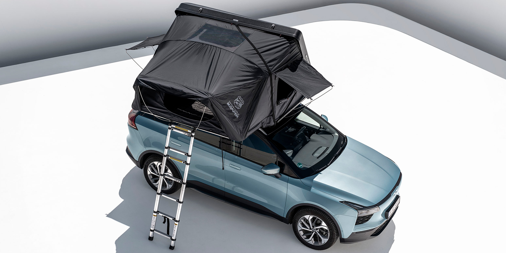 Aiways U5 er en stor bil. Og det er lige præcis derfor, det kan lade sig gøre at udstyre bilen med et telt på toppen. Det store tag gør det nemlig muligt at fastgøre en boks med indbygget telt til tagbøjlerne, så familen kan sove på taget af bilen.