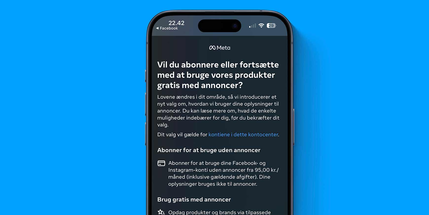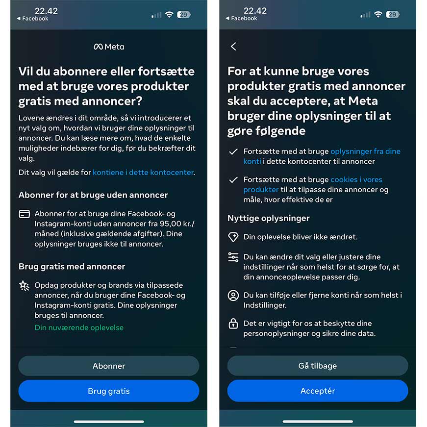 Besøgende på Facebook eller Instagram mødes nu med en mulighed for at tegne abonnement på tjenesterne. Formedelst 99 kroner om måneden kan du slippe for, at dine digitale gøremål benyttes til at servere reklamer, baseret på personlige oplysninger.