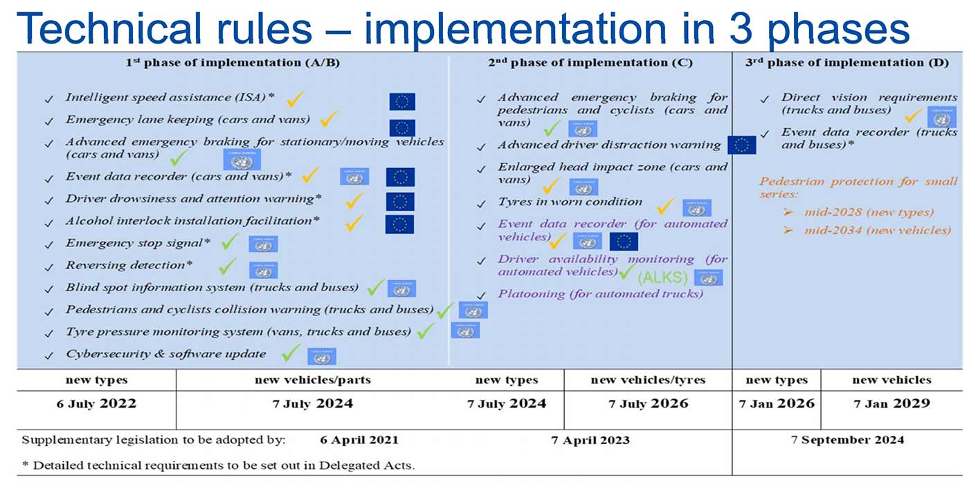 Overblik over de nye GSR-sikkerhedsregler og hvornår de indføres (grafik fra EU).