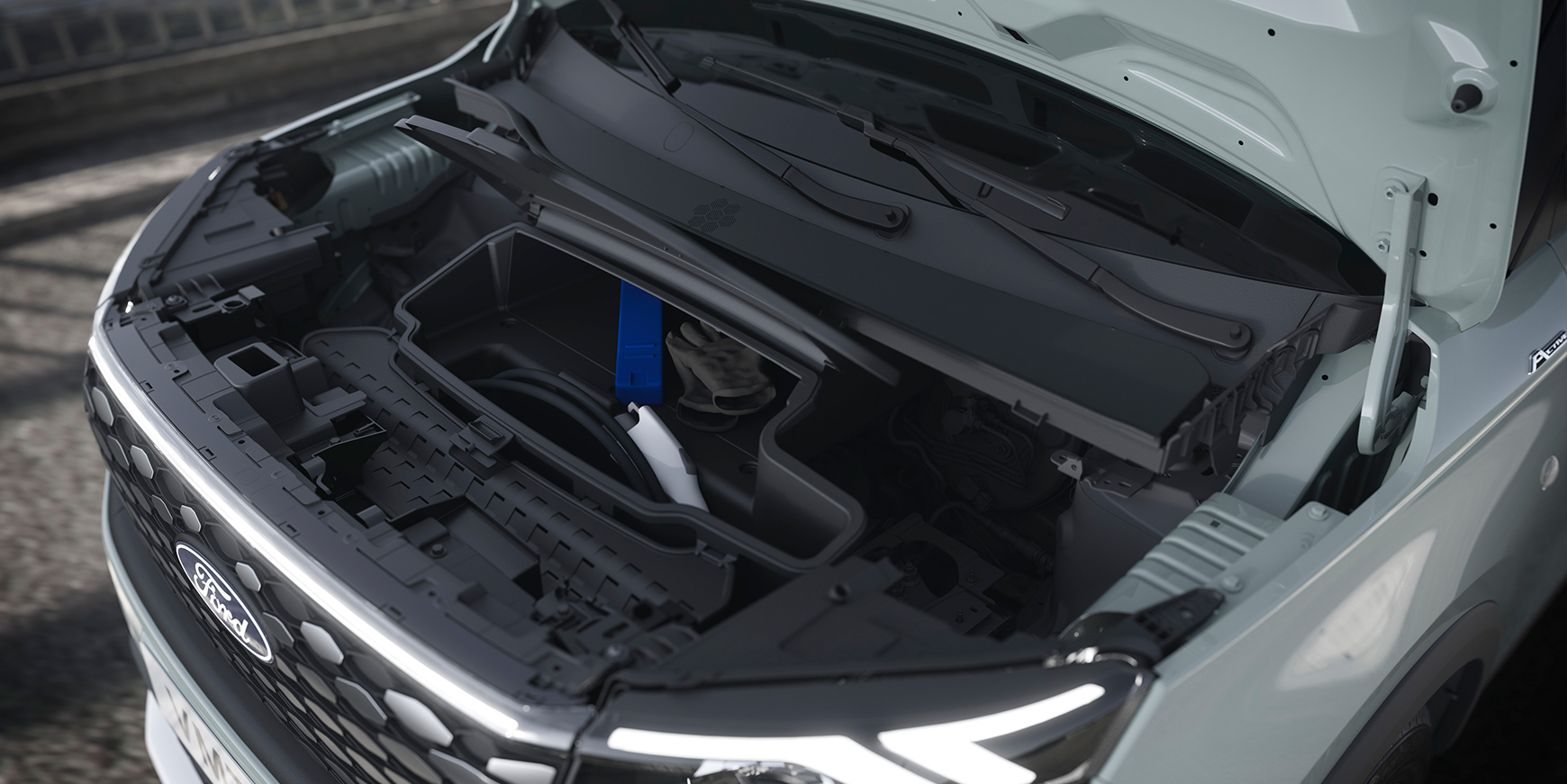 Bilen har et digitalt instrumentpanel og en 12-tommer touchskærm med Fords SYNC 4-system. Infotainmentsystemet er kompatibelt med både Android Auto og Apple CarPlay – også trådløst.