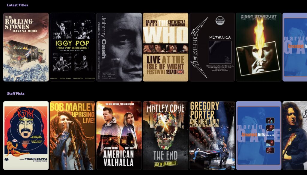 Kataloget spænder bredt fra start – fra storslåede øjeblikke som Queen live fra Wembley Stadium 1986, Ziggy Stardust and the Spiders fra marts 1973, The Rolling Stones live fra Checkerboard Lounge 1981, Nina Simone live fra Montreux 1976, Tupac live fra The House of Blues 2005 og Lenny Kravitz’ Just Let Go tour fra 2015 til Oasis, Queen, Bob Marley, Patti Smith, Bonnie Raitt, Sam Smith og mange, mange flere.