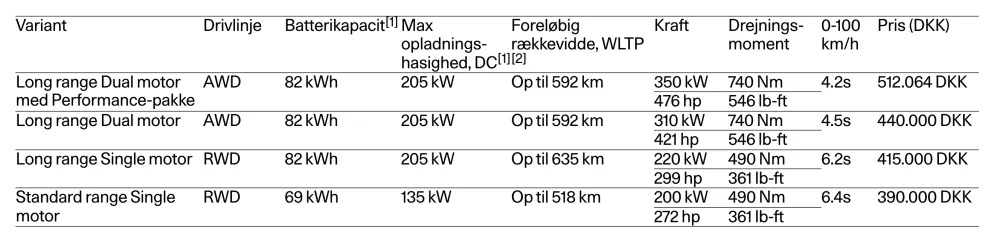 Batterierne giver også en længere rækkevidde på tværs af paletten. Long range Dual Motor opnår en øget rækkevidde på 592 km WLTP på grund af muligheden for at frakoble frontmotoren, hvilket er en forøgning på 105 km.