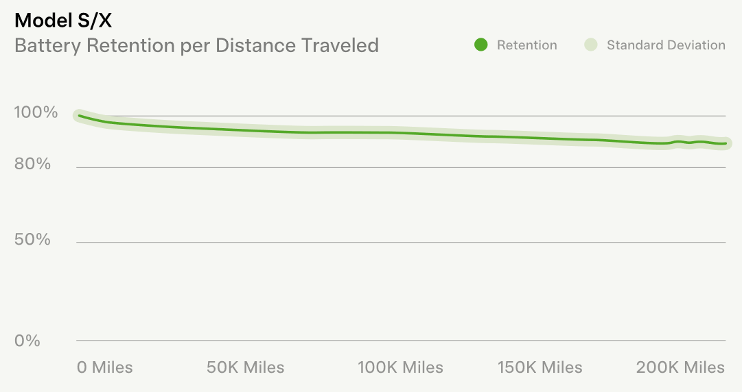 Ifølge selskabet selv, bevarer batteriet i Teslas dyrere modeller 88 procent af kapaciteten efter 320.000 kilometers kørsel. Det er interessant, da de i samme rapport for to år siden oplyste et kapacitetstab på “omkring 10 procent” efter 320.000 kilometer (200.000 miles). Det lader altså til at holde vand.