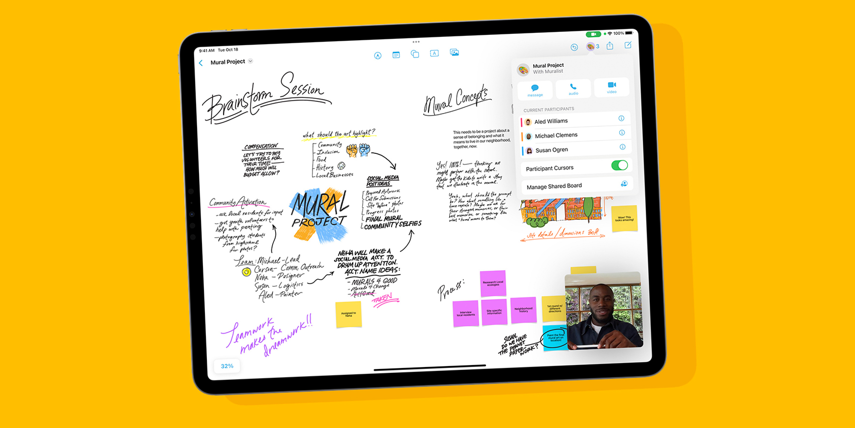 Brugerne kan også samarbejde med andre, mens de er i et FaceTime-opkald. Tavler i Fri gemmes i iCloud, så brugerne kan være synkroniserede på tværs af enheder.