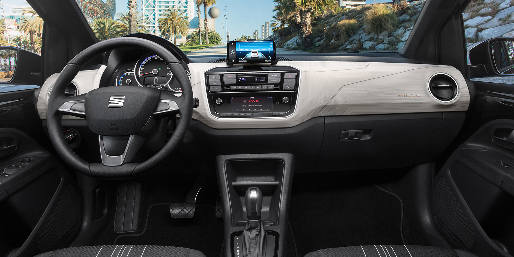 Inde i kabinen er instrumentbordet beklædt med en særlig Seat Mii electric-folie, ligesom bilen har klimaanlæg, højdejusterbart førersæde med varme og smartphone-integration med DriveMii App. Standardudstyret omfatter desuden varme i forruden, vejbaneassistent, trafikskiltegenkendelse, lys- og regnsensor og LED-kørelys.