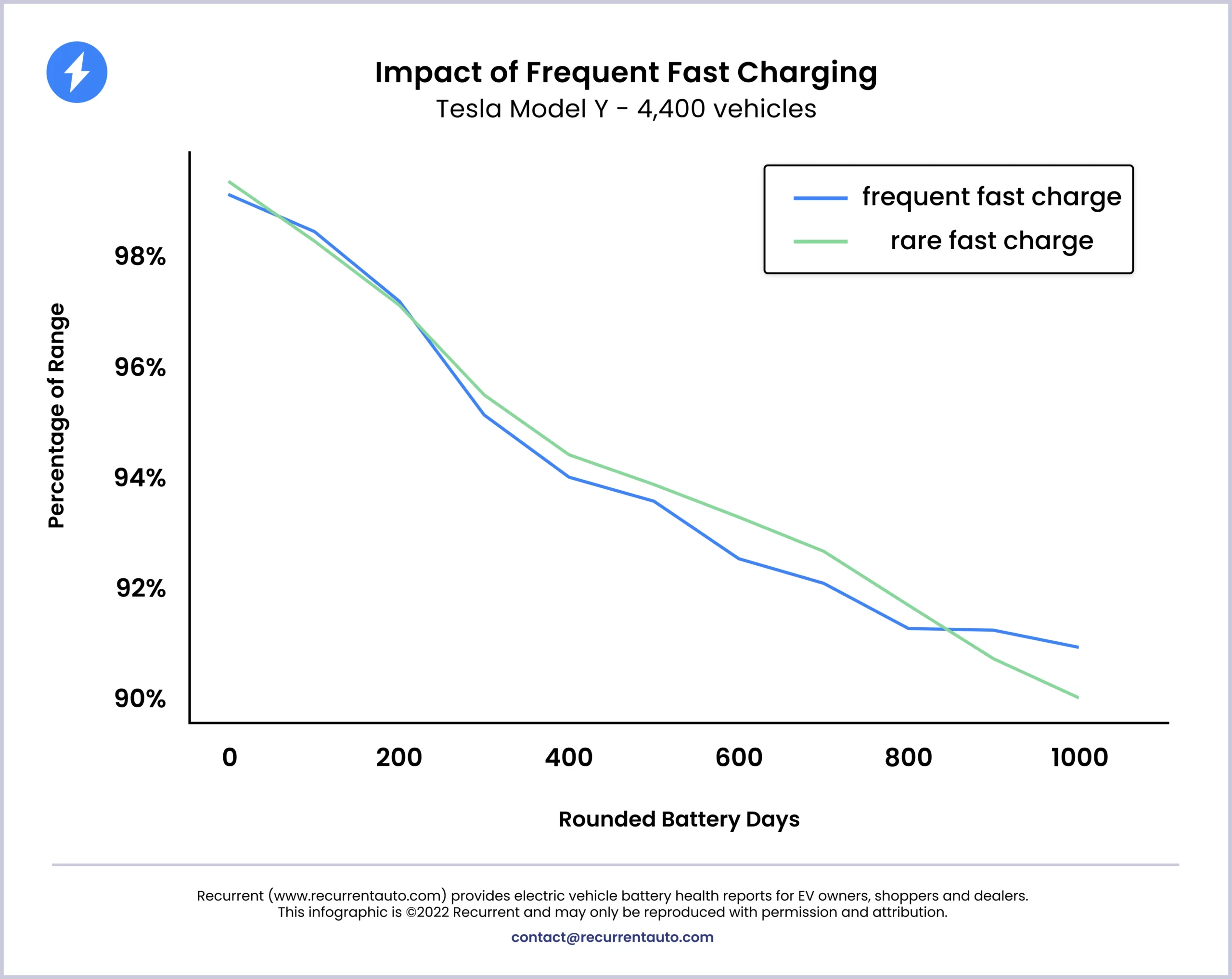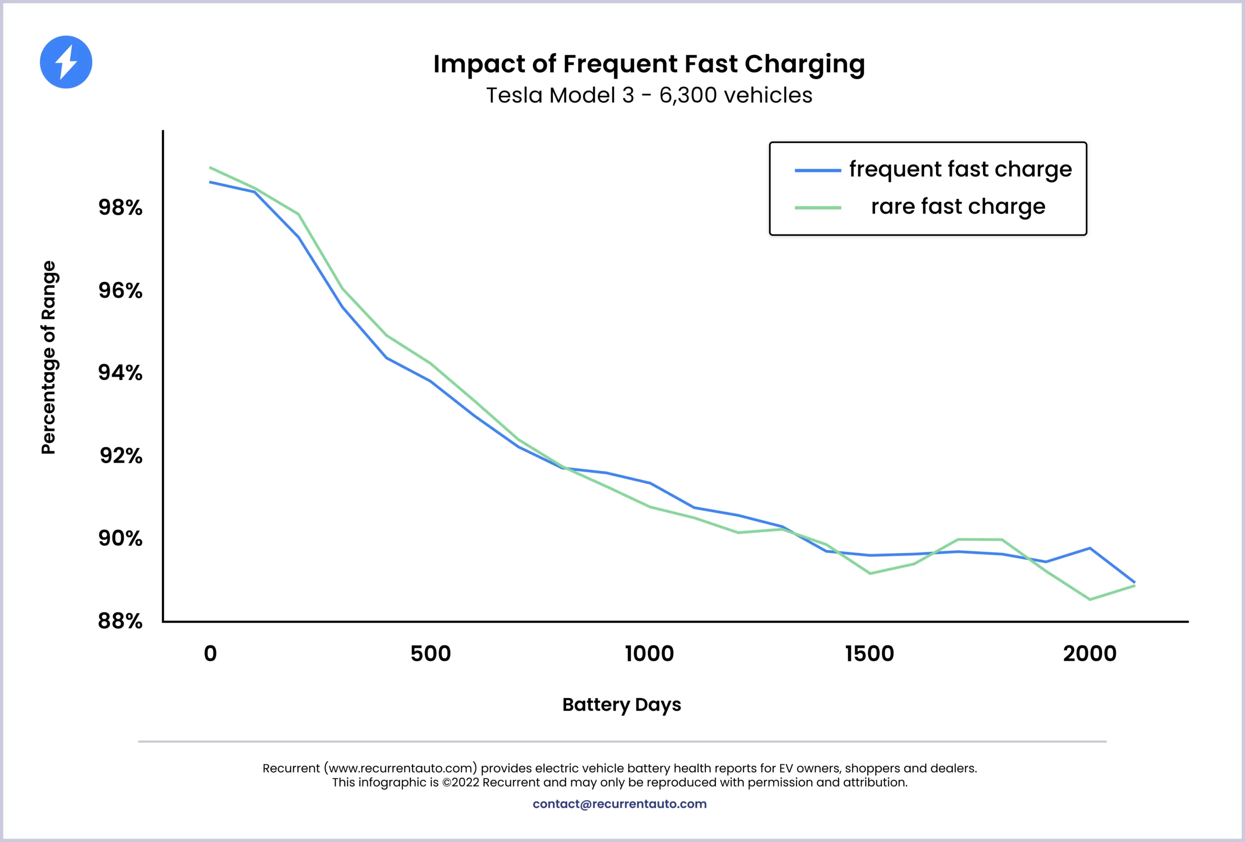 Derfor konkluderer Recurrent, at der ikke er hold i den gængse opfattelse af, at biler, der oftere hurtiglades, får væsentlig kortere rækkevidde efter nogle år.
