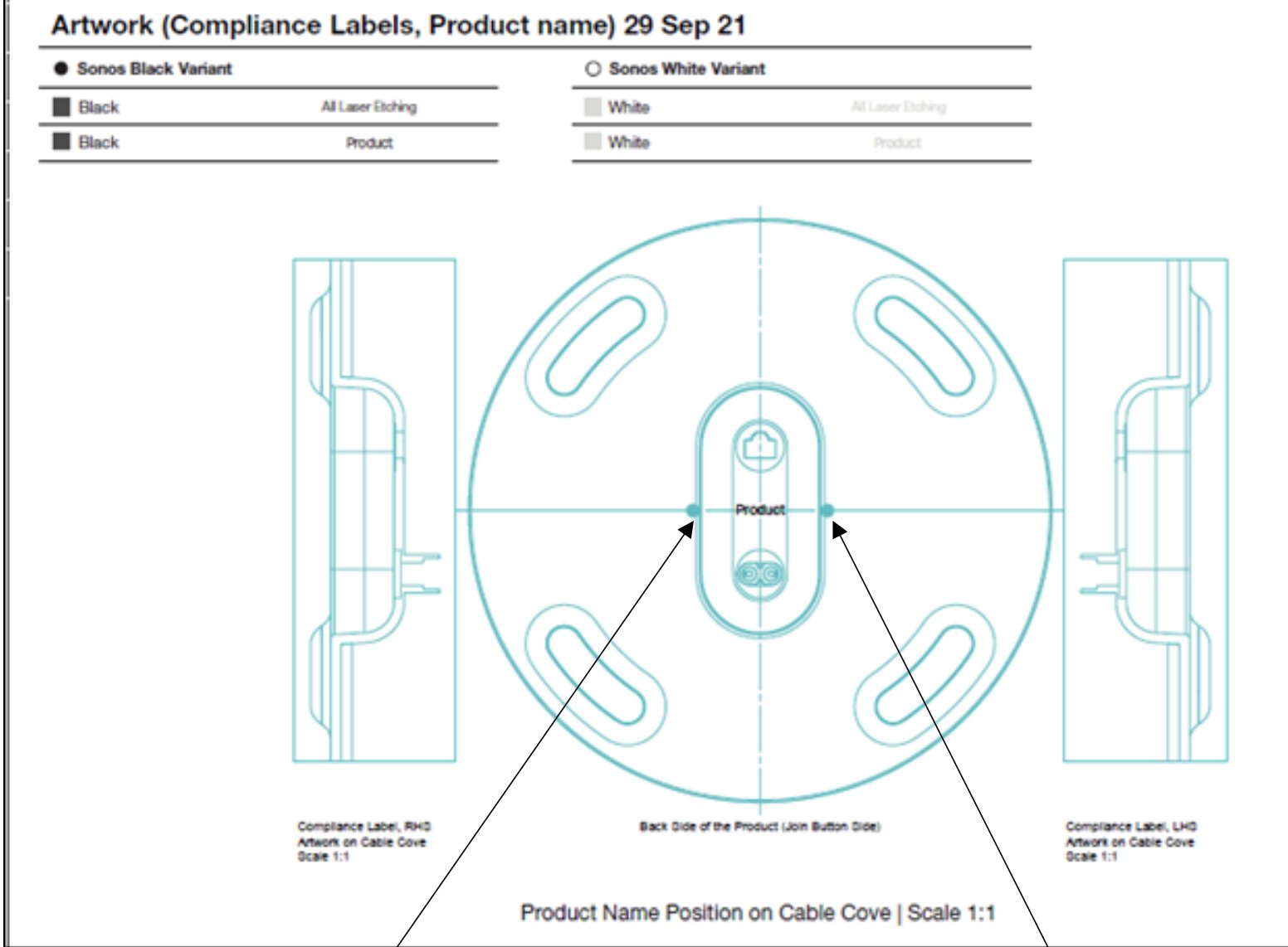 Illustrationen viser, at der i bunden er en udskæring, der rummer både netværksstik og strømstik. Ansøgningen viser også, at Sonos Sub mini vil kunne fås i både sort og hvid. Ikke at det er voldsomt overraskende, for det kan [næsten] samtlige Sonos produkter.