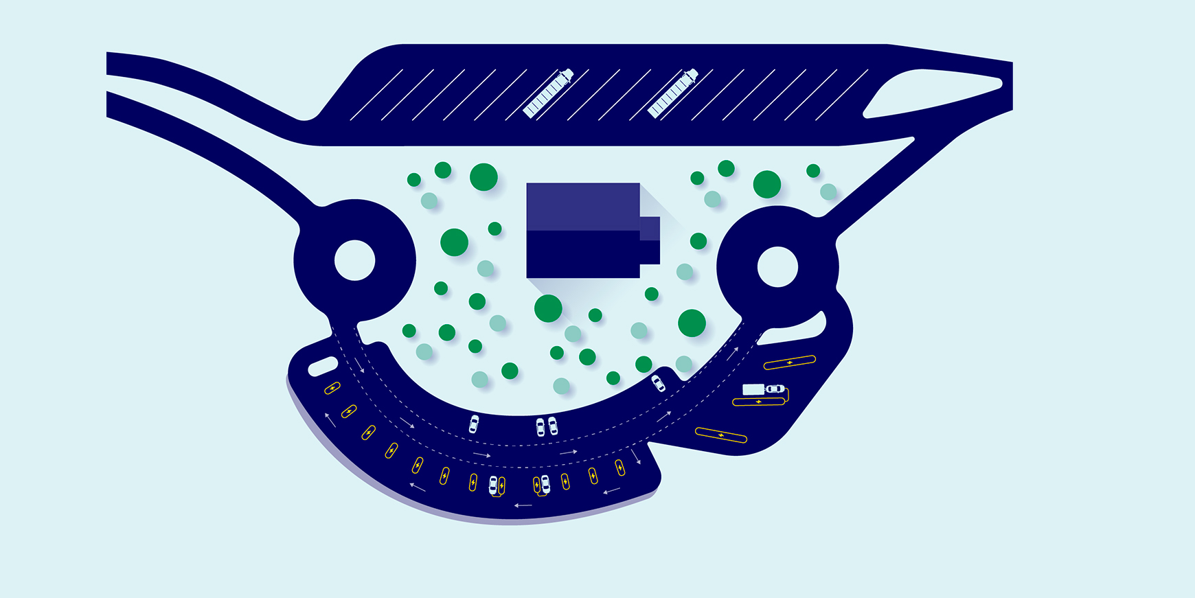 Den nye lynladepark er indrettet, så der er plads til, at trafikanterne kan cirkulere rundt på arealet for at finde en ledig plads. Det skal gøre det nemmere at få elbilen placeret rigtigt i forhold til ladestikket.