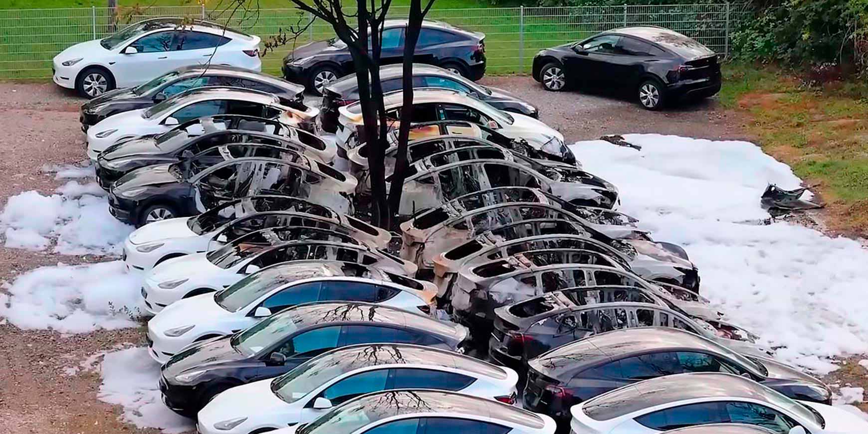 Under branden i Frankfurt udbrændte ti Tesla Model Y. Politiet vurderer, at branden er skyld i skader for en halv million euro – omkring 3,7 millioner kroner.