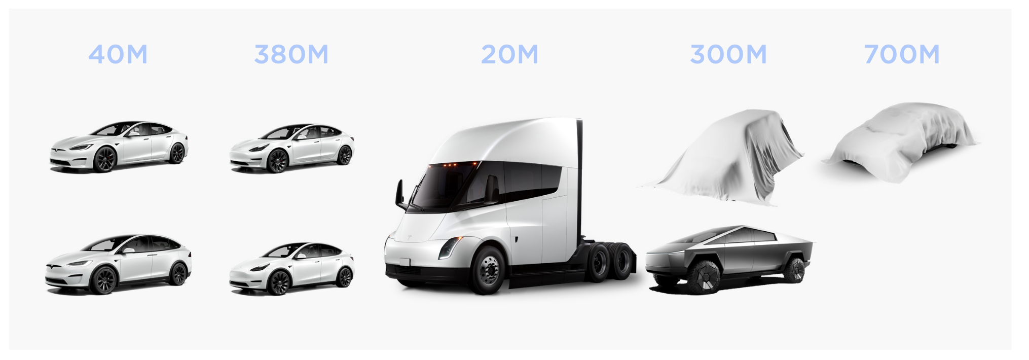Selv forventer Tesla, at en kompakt elbil umiddelbart vil kunne blive en kolossal succes. I skemaet skriver Tesla, at de forventer at skulle producere 42 millioner eksemplarer om året. Til sammenligning forventes der “kun” at skulle produceres 24 millioner eksemplarer af Model 3 og Model Y tilsammen.