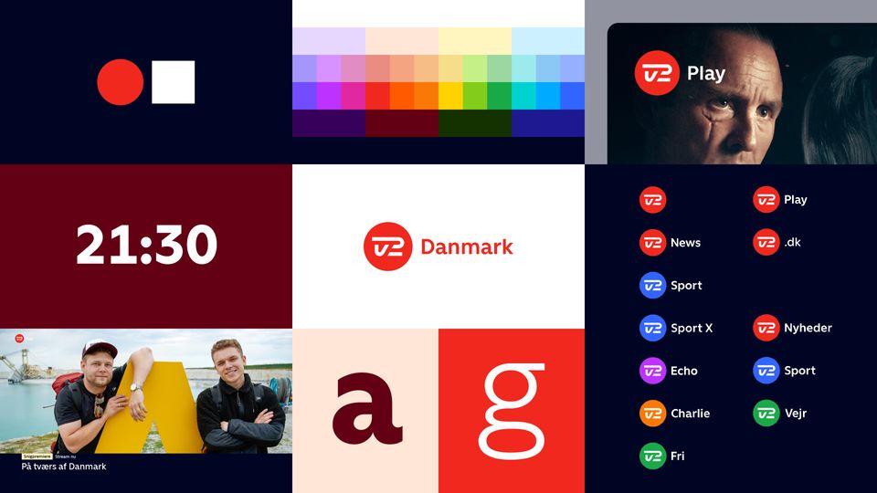 TV 2s nye udseende består af 34 nye farver, en ny skrifttype og et nyt logo. Elementerne skal samle TV 2s brands i et mere ensartet udtryk på tværs af platforme. TV 2 logoet har fået ny form og er placeret i en cirkel, der skal styrke slægtskabet mellem kanaler og platforme.